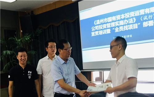 會(huì)上,舉行了《溫州市國(guó)有資本投資運(yùn)營(yíng)有限公司投資政策辦事流程匯編》授書儀式,王丹軍為各成員公司、部室負(fù)責(zé)人授書。辦事流程匯編收錄了公司投資管理辦法及其操作流程、市國(guó)資委12個(gè)相關(guān)工作辦事流程和及4個(gè)市政府最新產(chǎn)業(yè)政策文件。會(huì)上,投資發(fā)展部鄭曄就《溫州市國(guó)有資本投資運(yùn)營(yíng)有限公司投資管理辦法(試行)》與《溫州市國(guó)有資本投資運(yùn)營(yíng)有限公司投資政策辦事流程匯編》出臺(tái)背景、總體框架進(jìn)行了說(shuō)明。